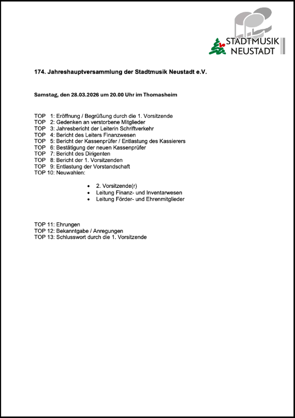 11März 174. Jahreshauptversammlung 11 März 2026 edvstadtmusik Leave a comment Tagesordnung HV 2026Herunterladen